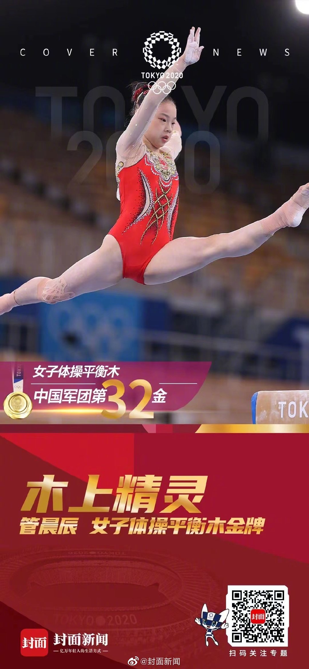管晨辰(2004年9月25日 - ),湖北 石首人,中国女子竞技体操运动员。 2012年11月由宁波体育运动学校输送至浙江省队,2017年进入国家体操队 。 她曾代表中国参加2020年夏季奥林匹克运动会体操比赛,夺得女子平衡木项目金牌,并联同队友获得女子团体项目的第七名。 。她是参加东京奥运会中国. 体操女子平衡木资格赛在东京有明体 操竞技场开赛,慈溪籍小花管晨辰以 14.933分暂列平衡木项目第一。 她的这套平衡木,看点很多。 管晨辰一上场,央视的解说员陈滢就 这样介绍。管晨辰在资格赛中的动作 难度为6.9分,身穿中国红战衣 推荐使用新版 edge 、 chrome 、 qq 等浏览器. 8月3日,中国选手管晨辰在比赛中。 当日,在东京奥运会体操项目女子平衡木决赛中,中国选手管晨辰夺得冠军,唐茜靖获得亚军。 新华社记者 程敏 摄.